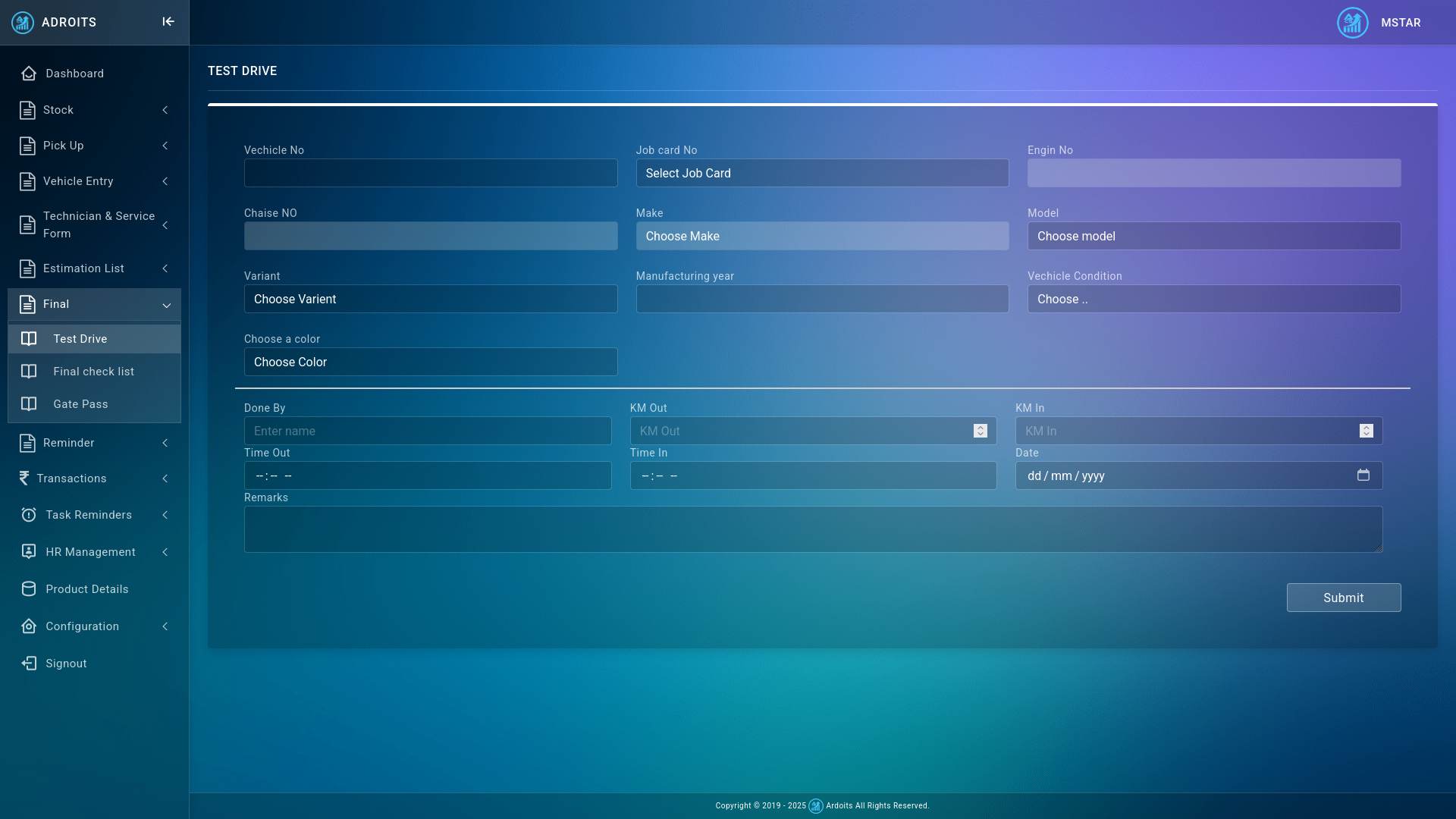 The Test Drive and Financial Report modules in Sales Pro work together to ensure complete quality control and financial transparency within a vehicle service business. The Test Drive module verifies the performance and reliability of every serviced vehicle before delivery, allowing technicians or service advisors to record detailed observations on vehicle behavior, performance, and complaint resolution. It supports digital signatures for accountability and automatically links the feedback to the respective job card, ensuring no vehicle is released without proper testing and approval. Meanwhile, the Financial Report module provides a comprehensive, real-time overview of the workshop’s financial activities by compiling data from invoices, payments, job cards, and stock transactions. It generates detailed reports on daily revenue, expenses, outstanding payments, GST, and profit margins, enabling easy tracking and analysis of financial performance. Together, these modules enhance service quality, operational accuracy, and business profitability—ensuring that every vehicle is thoroughly tested, every transaction is accurately recorded, and every decision is backed by reliable data within the Sales Pro system.